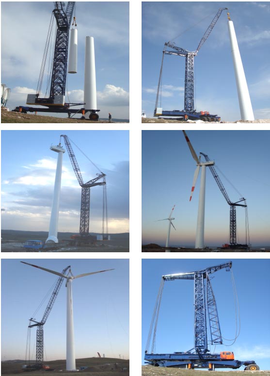我公司自主研發(fā)的第一臺輪胎行走式風(fēng)電吊機(jī)于2008年9月交付使用,於內(nèi)蒙古察右中旗風(fēng)電項目由天津電建順利完成現(xiàn)場吊裝任務(wù),此一風(fēng)電吊機(jī)采用輪胎式行走,具有轉(zhuǎn)場便利、抗風(fēng)性強(qiáng)吊裝穩(wěn)定、起升高度高、起重量大等優(yōu)點,此風(fēng)電吊機(jī)采用柴油引擎驅(qū)動,最大爬坡30%,行車速度0~5km/h,最大起升高度90m,最大吊重80t(15m處) ,可滿足所有1.5兆KW風(fēng)電機(jī)租吊裝要求。