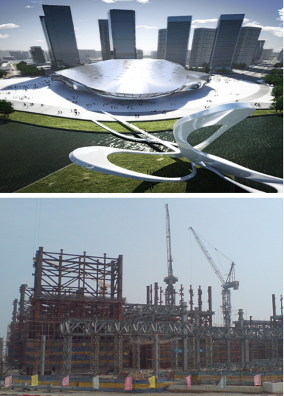 大連國際會議中心 由中建八局大連分公司承建采用中昇建機(jī) 二臺ZSL750行走式動臂塔機(jī)最大吊重15m處吊50t