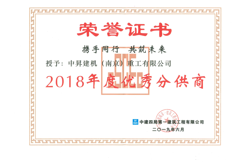 2019年7月,中昇建機代表應邀出席中建四局第一建筑工程有限公司(以下簡稱“中建四局一公司”)“2019年項目建設總結(jié)表彰大會”,中昇建機以優(yōu)異的產(chǎn)品和服務在眾多供應商中脫穎而出,榮獲“2018年度優(yōu)秀分供商”榮譽稱號。