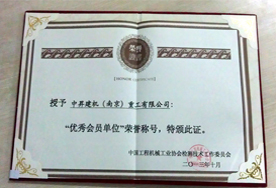 熱烈祝賀中昇建機(南京)重工有限公司于2013年10月被中國工程機械工業(yè)協(xié)會檢測技術(shù)工作委員會授予“優(yōu)秀會員單位”榮譽稱號。 2013-12-28 |
