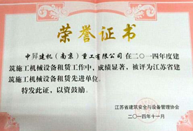 中昇建機被評為2014年度“江蘇省建筑施工機械設(shè)備租賃先進單位”榮譽稱號